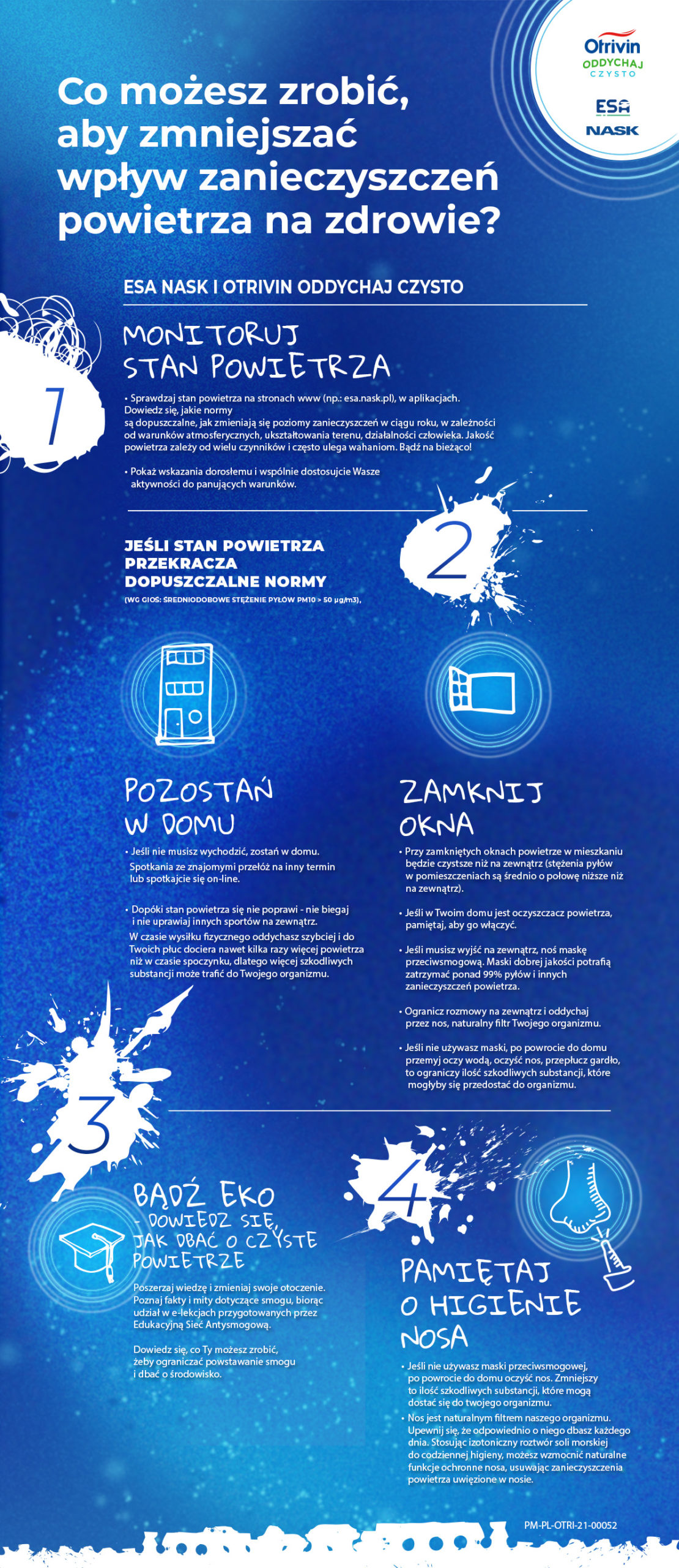 ? Szkoły, jako instytucje kształcące dzieci i młodzież oraz ważne ośrodki opiniotwórcze, są doskonałym miejscem, by to w nich właśnie upowszechniać wiedzę na temat zanieczyszczenia powietrza i jego skutków dla zdrowia. Nasz przekaz kierujemy zarówno do dzieci, jaki i dorosłych ? nauczycieli i rodziców. W ten sposób pomagamy całym lokalnym społecznościom w dostrzeżeniu i zrozumieniu problemów mających wpływ na jakość życia ? mówi Barbara Leśniczak, z Państwowego Instytutu Badawczego NASK, partnera merytorycznego kampanii, który od lat realizuje program dla szkół Edukacyjna Sieć Antysmogowa. ? Scenariusze lekcyjne oraz porady dla dzieci, nauczycieli i rodziców, przygotowane w ramach kampanii ?Pomóżmy Dzieciom Oddychać Lepiej? zainicjowanej przez Otrivin Oddychaj Czysto, pomogą w łatwy i przystępny sposób przekazać wiedzę na temat zanieczyszczenia powietrza, które według WHO stanowi największe zagrożenie środowiskowe dla naszego zdrowia. Początek roku szkolnego to idealny moment na tego typu działania. Dzięki temu nauczyciele i rodzice będą mogli odpowiednio przygotować się na czas, kiedy stężenia smogu są największe, czyli sezon grzewczy ? dodaje ekspertka.